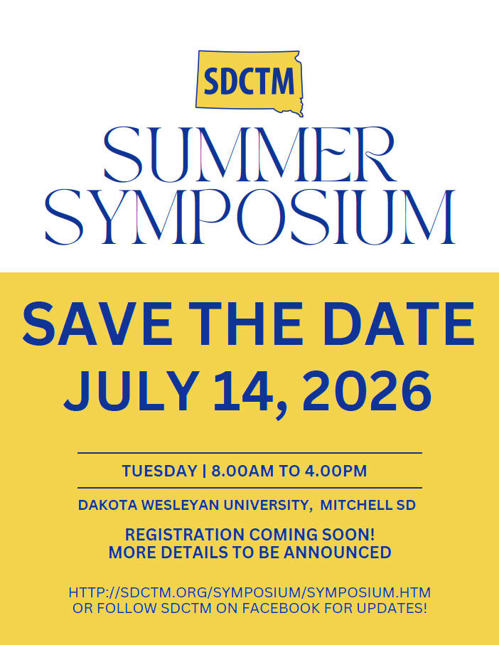 Not a member (yet)? All you have to do is join! You may join when you register for the symposium and then qualify for membership rates. Please use the symposium registration form to join instead of the form on the SDCTM website. The SDCTM membership year is from February 1 through January 31 of the following year. Dues are not pro-rated from time of joining.